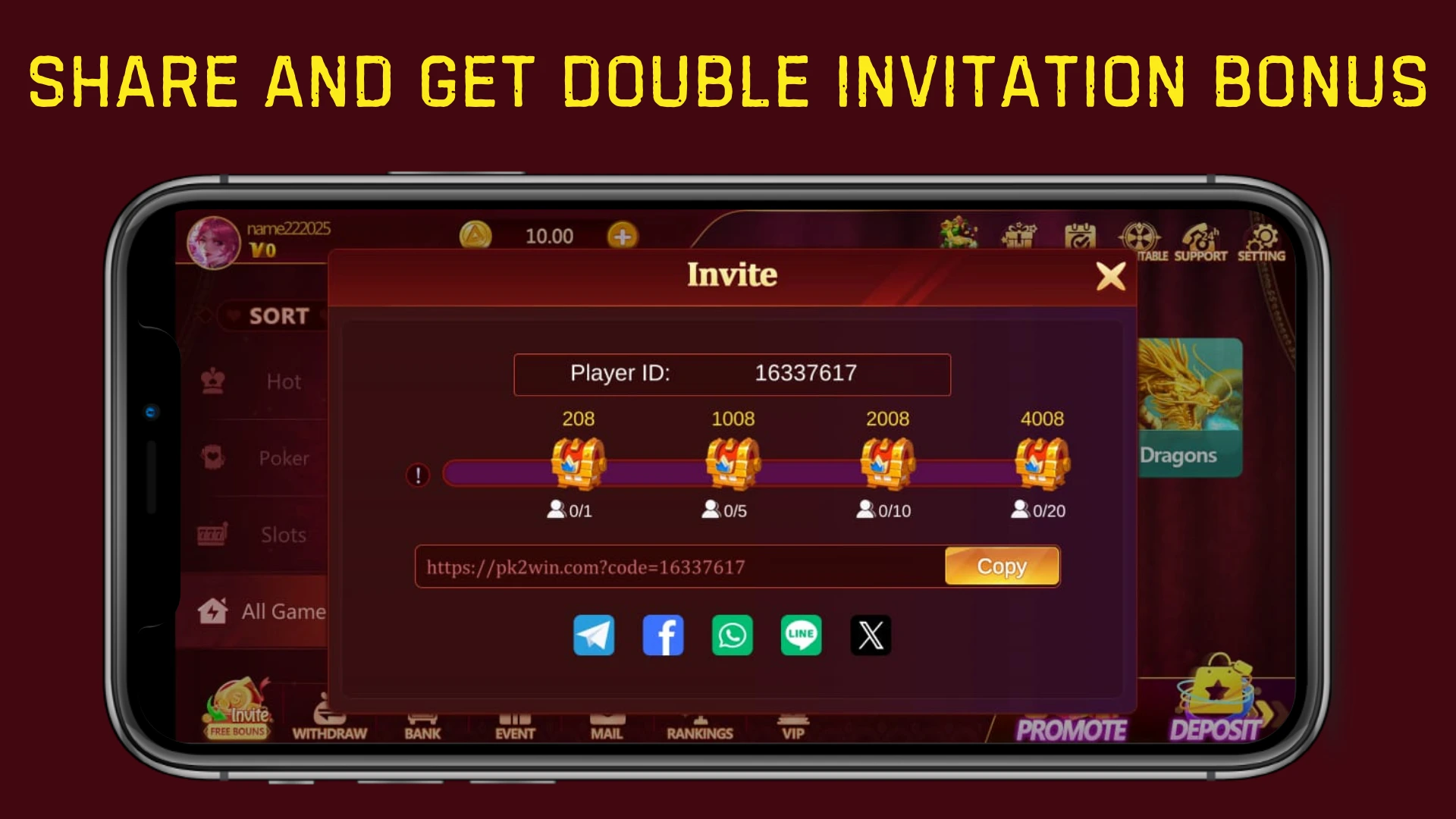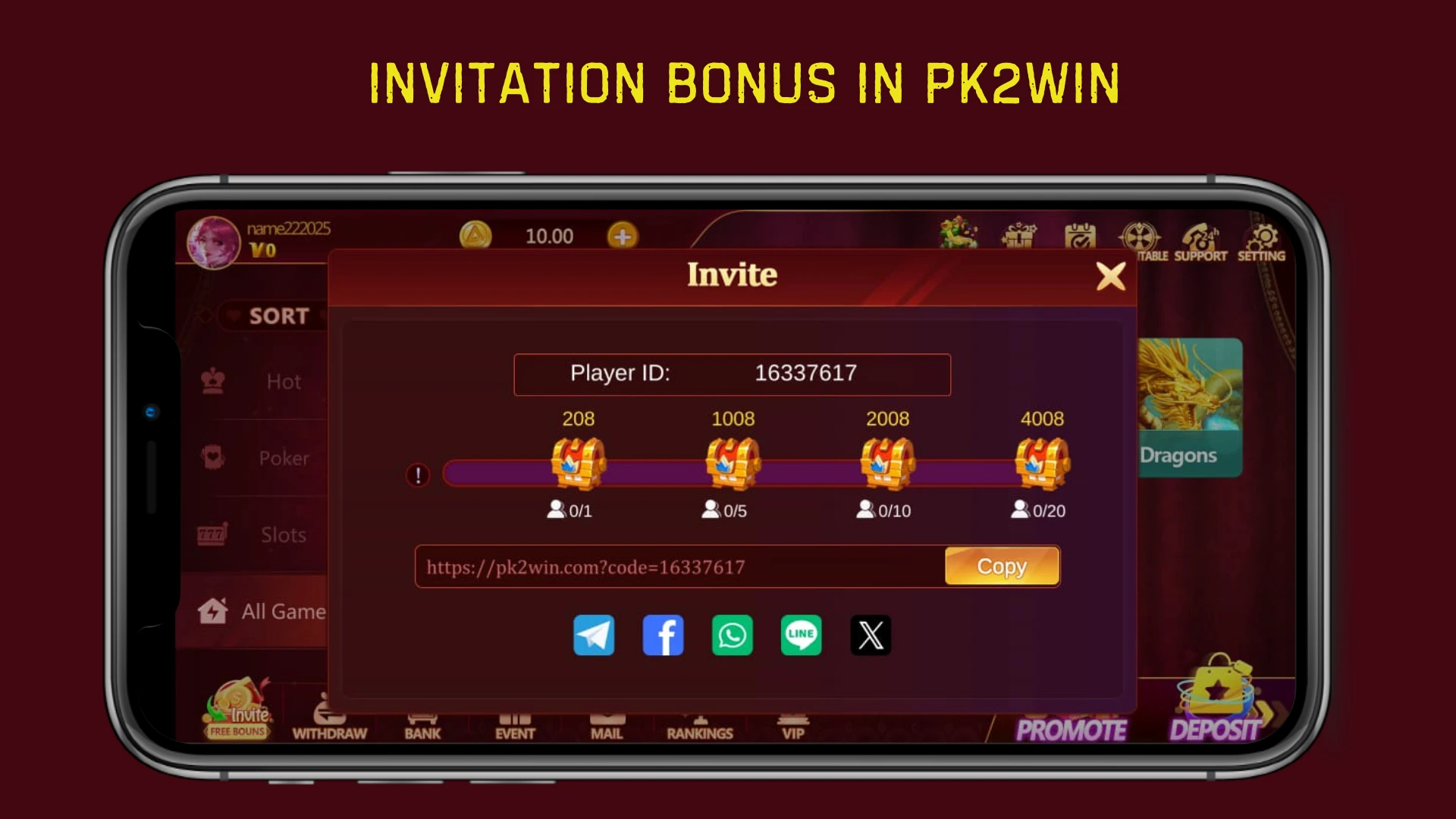 Invite friends to join Pk2Win and earn bonus credits every time they sign up and make a deposit.